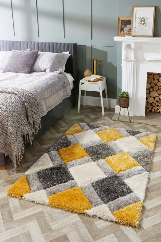 Origins 3D GEO Soft Silky Shaggy Modern Diamond Rug in Ochre Yellow Grey