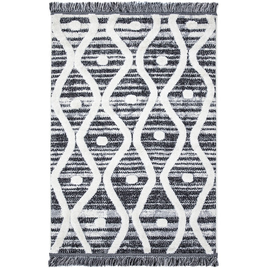 Skandi Boho Rug for Living Room Dining Room Bedroom Traditional Bohemian Cream Anthracite Fringed Rug