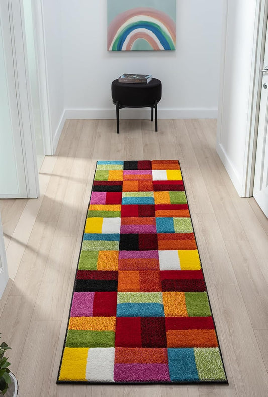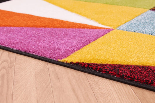 Hand-Carved Geometric Multi-Coloured Rug – Largo Multi – Modern Spectrum Patchwork Design for Living Room or Bedroom