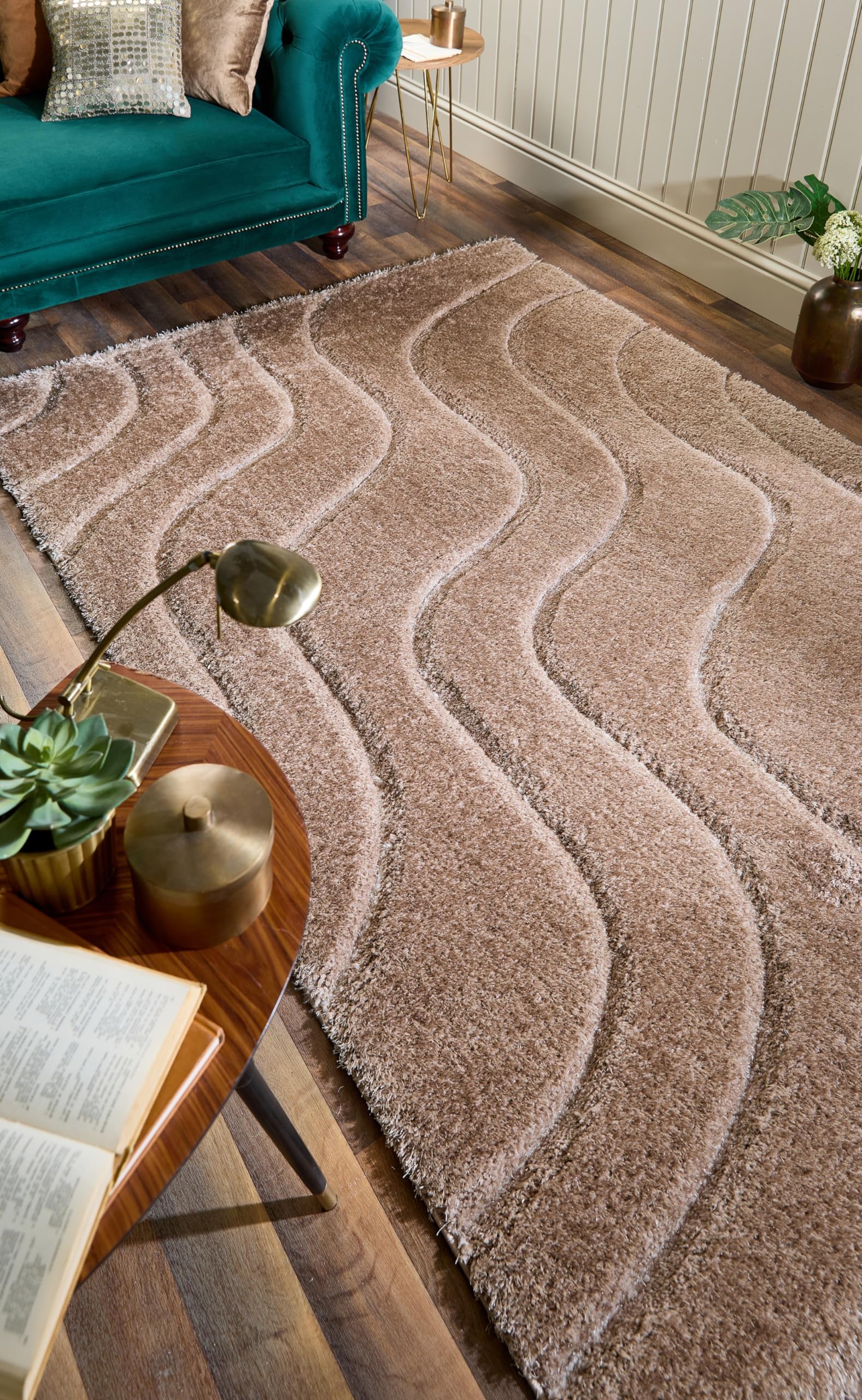 - Die Waves Carved Rugs-Kollektion verwendet erdige Farben mit einem Hauch von Glanz und erzeugt so ein mühelos luxuriöses Gefühl, das perfekt in Wohnzimmer und Schlafzimmer passt.
