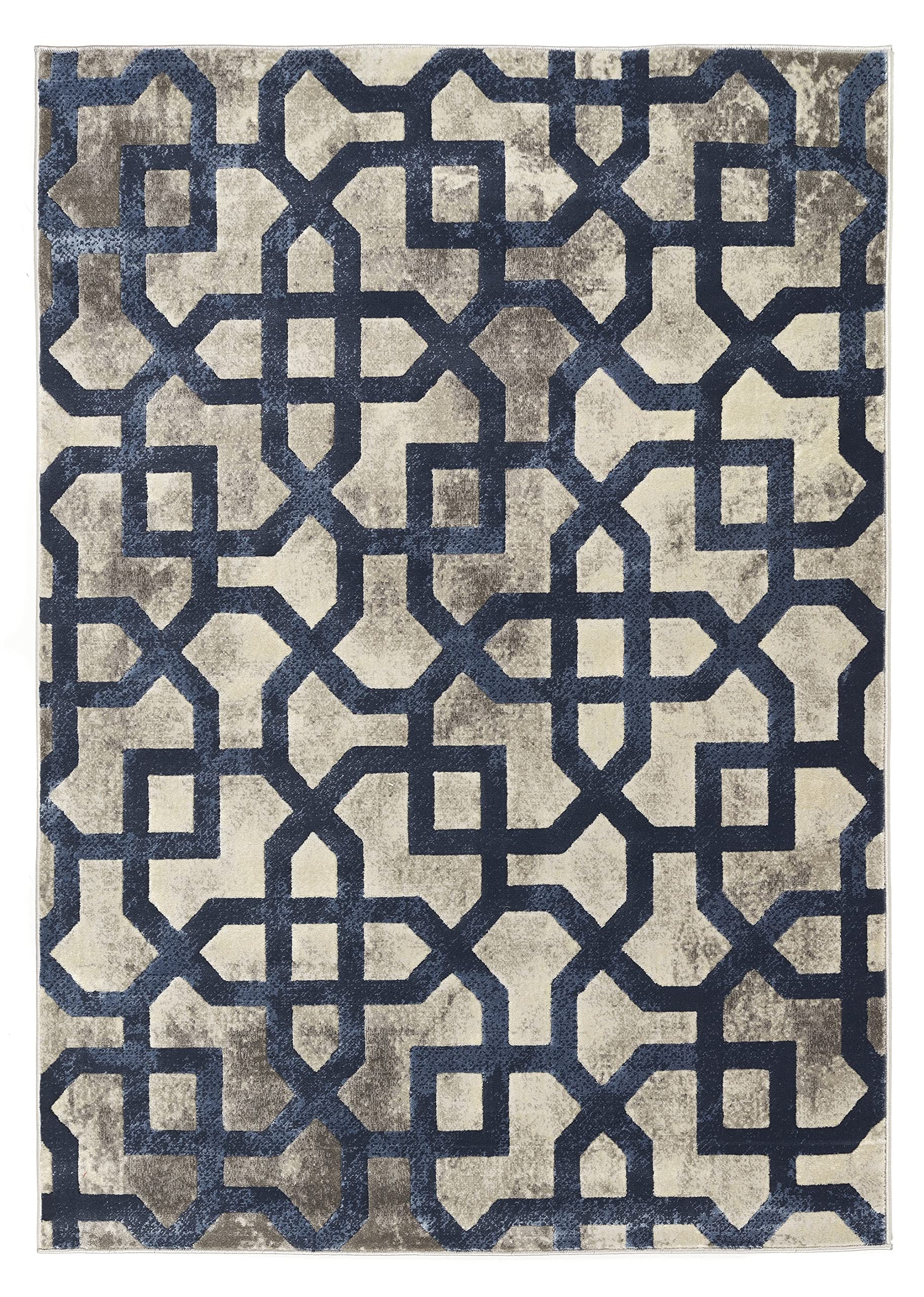 Schwelgen Sie in zeitloser Eleganz mit unserem marokkanischen Fliesenteppich, einem vielseitigen Stück, das nahtlos zwischen traditionellen und modernen Inneneinrichtungen wechselt. Dieser majestätische Teppich zeigt eine fesselnde Darstellung geometrischer Formen vor einem wunderschön verwitterten Hintergrund und setzt so einen markanten Blickfang in jedem Raum. Dieser auf Langlebigkeit ausgelegte Teppich ist nicht nur langlebig, sondern auch bemerkenswert pflegeleicht und bietet ein hervorragendes Preis-Leistungs-Verhältnis. Seine klassischen Farben verleihen Ihrem Raum einen Hauch von Raffinesse und machen ihn zu einer vielseitigen Ergänzung Ihrer Inneneinrichtung. Für einen zeitgenössischen Twist verfügt unser marokkanischer Fliesenteppich über ein modernes geometrisches Muster, das vom neusten Ombre-Trend durchzogen ist. Was ihn jedoch auszeichnet, sind die subtilen metallischen Akzente, die Ihrem Foyer oder jedem anderen Raum einen Hauch von Glamour und Raffinesse verleihen. Verwandeln Sie Ihr Zuhause mit dem zeitlosen Charme und dem modernen Flair unseres eleganten Teppichs, bei dem klassisches Design auf zeitgenössischen Stil trifft und so ein wahrhaft fesselnder Look entsteht.