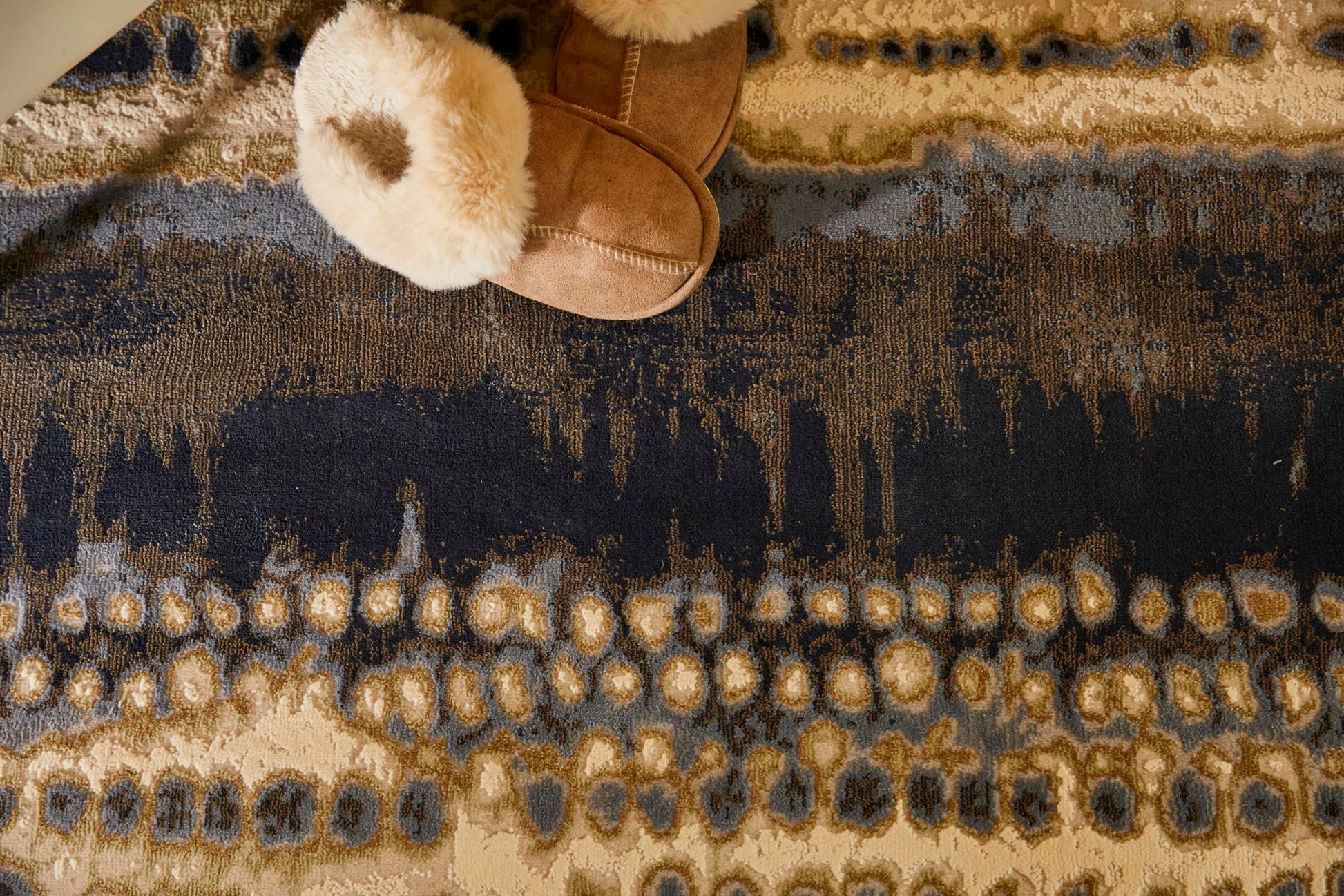 - The stunning polypropylene pile in navy-cream colour palette and striped-abstract pattern brings a taste of glamour and lavishness right to your living space.