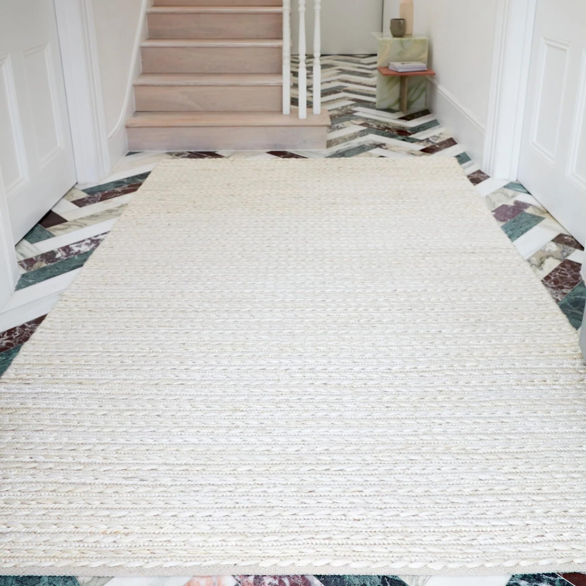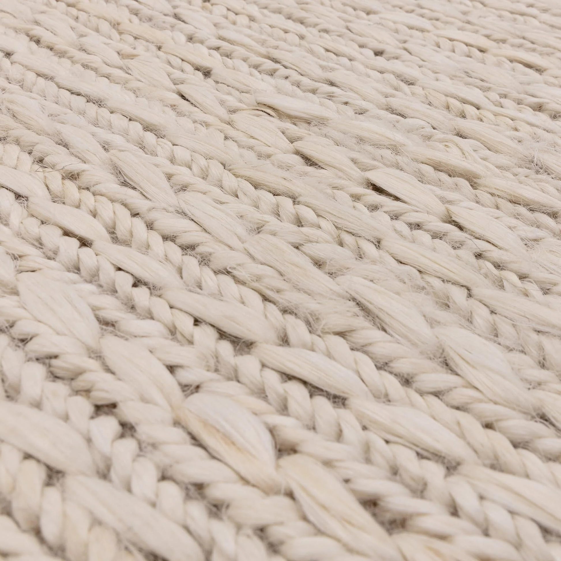 - This handwoven rug features a chunky weave that highlights its natural fiber composition, offering both durability and a tactile experience.